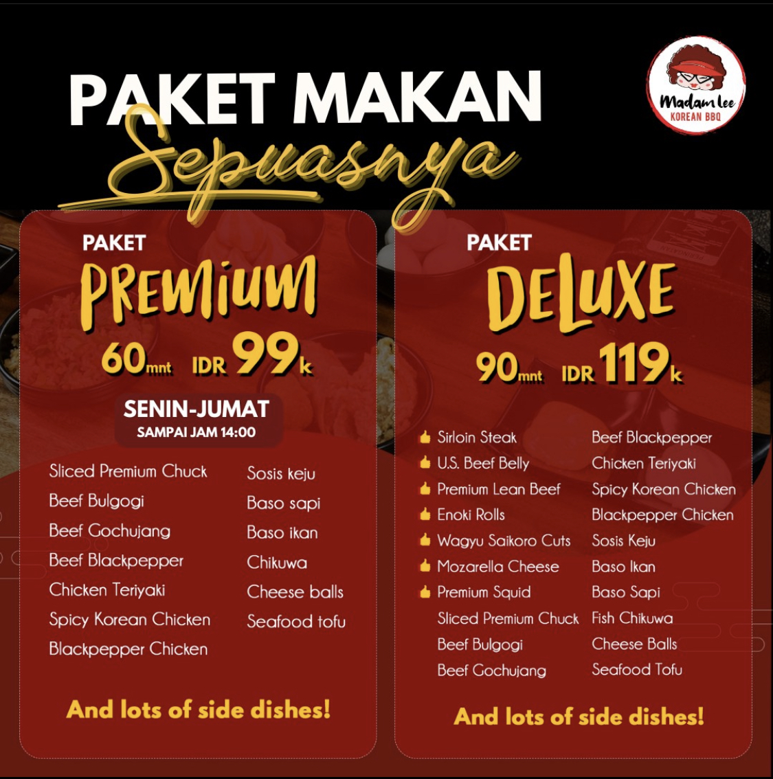 Introducing the Menu at Madam Lee Korean BBQ Tang City is a culinary journey that captures the essence of Korean barbecue. Nestled in Ruko Tang City, this restaurant offers an exceptional All-You-Can-Eat (AYCE) Deluxe Package that is sure to impress. Diners can indulge in a diverse selection of meats, including succulent steak, saikoro beef, and freshly grilled seafood like shrimp and squid. The experience is complemented by delightful sides such as flavorful sukiyaki and cheesy dishes that elevate your meal.